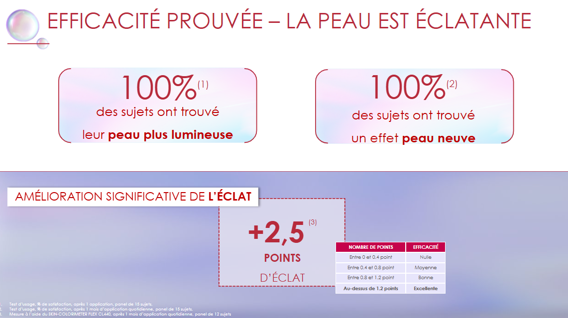 Dès la première utilisation, la peau paraît plus nette, plus lisse et visiblement plus lumineuse. Jour après jour, le teint est unifié et la qualité de peau améliorée.